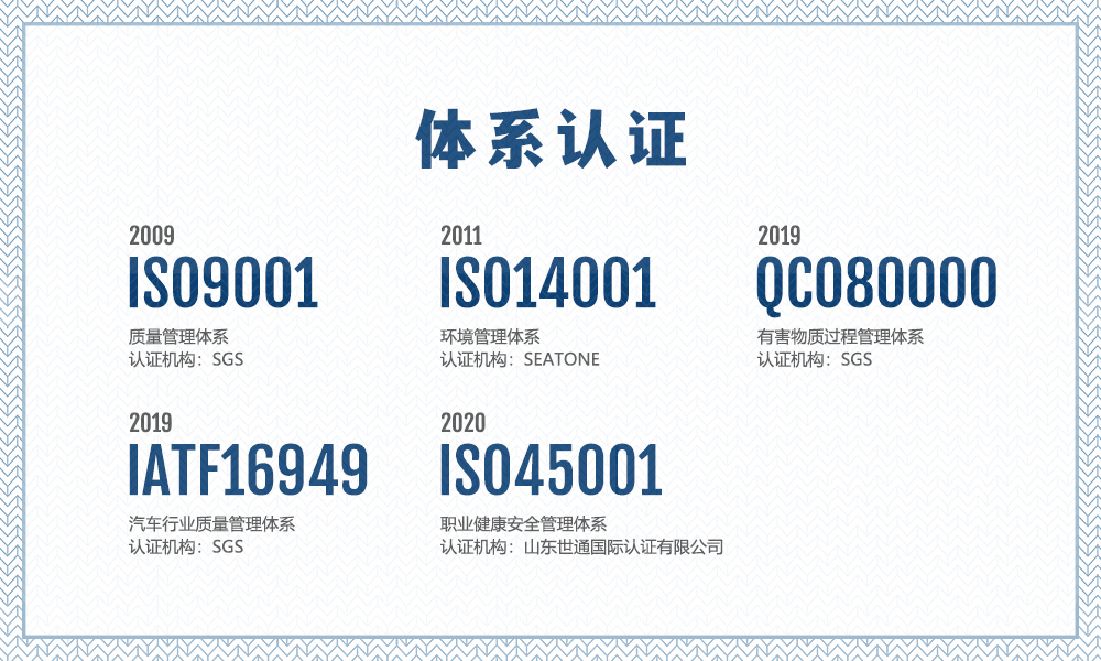 公司制定了“以質(zhì)量創(chuàng)信譽(yù),以服務(wù)爭客戶,以科技求創(chuàng)新,以改進(jìn)促發(fā)展”的質(zhì)量方針,建設(shè)了山東省工程實(shí)驗(yàn)室、山東省企業(yè)技術(shù)中心、山東省“一企一技術(shù)”研發(fā)中心,通過了ISO9001質(zhì)量管理體系、ISO14001環(huán)境管理體系、QC080000體系、IATF16949汽車體系、ISO45001職業(yè)健康管理體系及企業(yè)知識(shí)產(chǎn)權(quán)管理體系,兩化融合管理體系等認(rèn)證,使公司產(chǎn)品質(zhì)量達(dá)到國際化標(biāo)準(zhǔn),為產(chǎn)品穩(wěn)定性提供強(qiáng)有力的體系保證。
