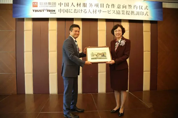 2016年5月18日上午,聯(lián)橋集團(tuán)與株式會(huì)社TRUST TECH“中國人材服務(wù)項(xiàng)目合作意向簽約儀式”在東京舉行,聯(lián)橋集團(tuán)董事長慕镕鍵與株式會(huì)社TRUST TECH社長西田穣代表雙方簽署了合作協(xié)議,威海市委副書記、市長張惠,高區(qū)黨工委書記、管委會(huì)主任劉偉,威海市商務(wù)局局長鄧勇,聯(lián)橋集團(tuán)董事、副總經(jīng)理于福杰等領(lǐng)導(dǎo)出席儀式。