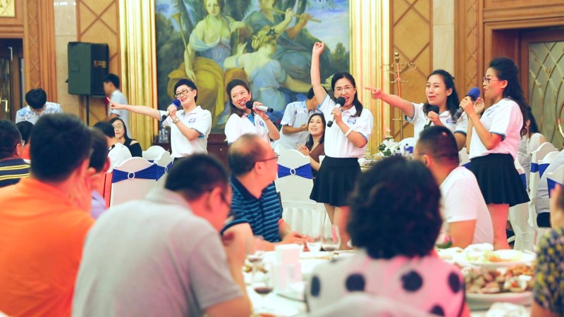 如果說下午的座談讓大家受益匪淺,那么晚上的接待晚宴,則讓所有學(xué)員感到興奮不已和深深震撼。在慕衛(wèi)波董事幽默風(fēng)趣的祝酒詞后,在杯盞交換暖意融融的席間,隨著悠揚(yáng)的音樂響起,深情的《老同學(xué)》歌聲從身邊飄來,拉開了由聯(lián)橋藍(lán)色暢想合唱團(tuán)快閃表演的帷幕?!锻辍?、《哎呦媽媽》、《朋友》等經(jīng)典歌曲,帶給現(xiàn)場(chǎng)學(xué)員一次又一次的驚喜,《我的太陽》則將整場(chǎng)晚宴推向了高潮。
