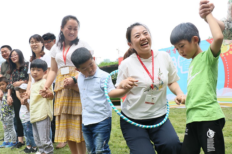 員工和孩子們手牽手站成兩列,分別傳遞呼啦圈。爸媽耐心為孩子們講解規(guī)則,孩子們幫著爸媽提高傳遞速度。這傳遞的不是呼啦圈,而是快樂和溫暖呀。
