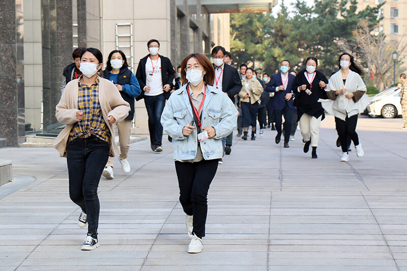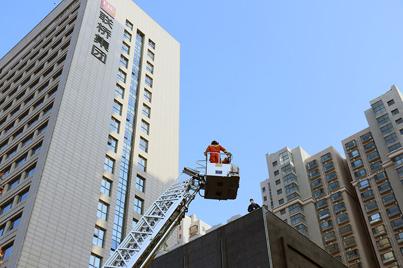 當(dāng)天15:00,聯(lián)橋集團(tuán)運營總監(jiān)、消防疏散演練總指揮劉旭波一聲令下,演練正式拉開帷幕。警報聲響起,全體員工在各樓層安全員引導(dǎo)下迅速有序疏散到安全地帶,并進(jìn)行點名,與此同時消防車呼嘯而來,利用云梯消防車營救避難平臺被困人員,隨后,消防員成功撲滅“火災(zāi)”。