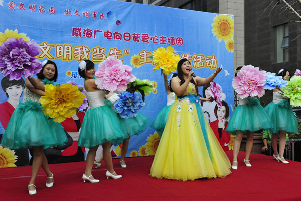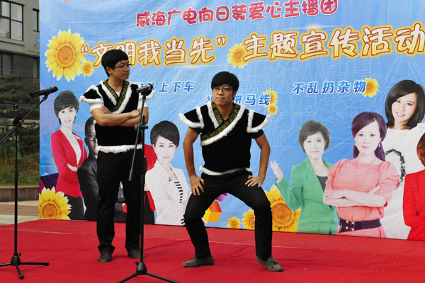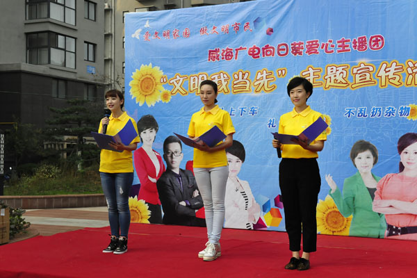 2015年10月16日,威海廣電攜手聯(lián)橋集團(tuán)在集團(tuán)海天一品社區(qū)噴泉廣場(chǎng)舉行“文明我當(dāng)先”主題宣傳活動(dòng)。威海電視臺(tái)愛(ài)心主播白雪、張帆、齊賽、劉偉豪等親臨現(xiàn)場(chǎng),通過(guò)節(jié)目表演、知識(shí)講解,做游戲等形式,與大家互動(dòng)交流,在輕松愉快中傳播“愛(ài)文明家園做文明市民”的理念。